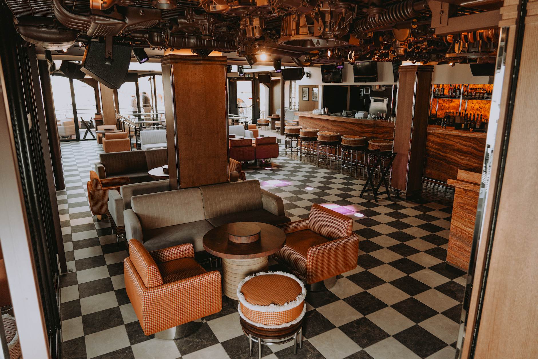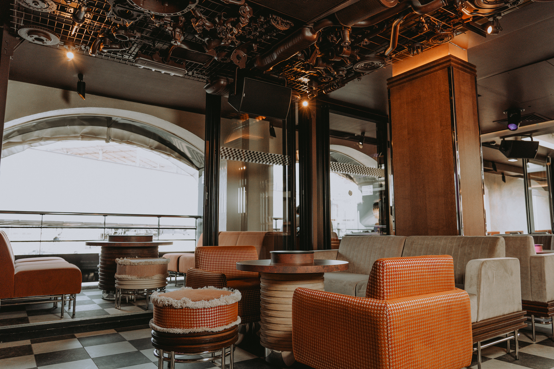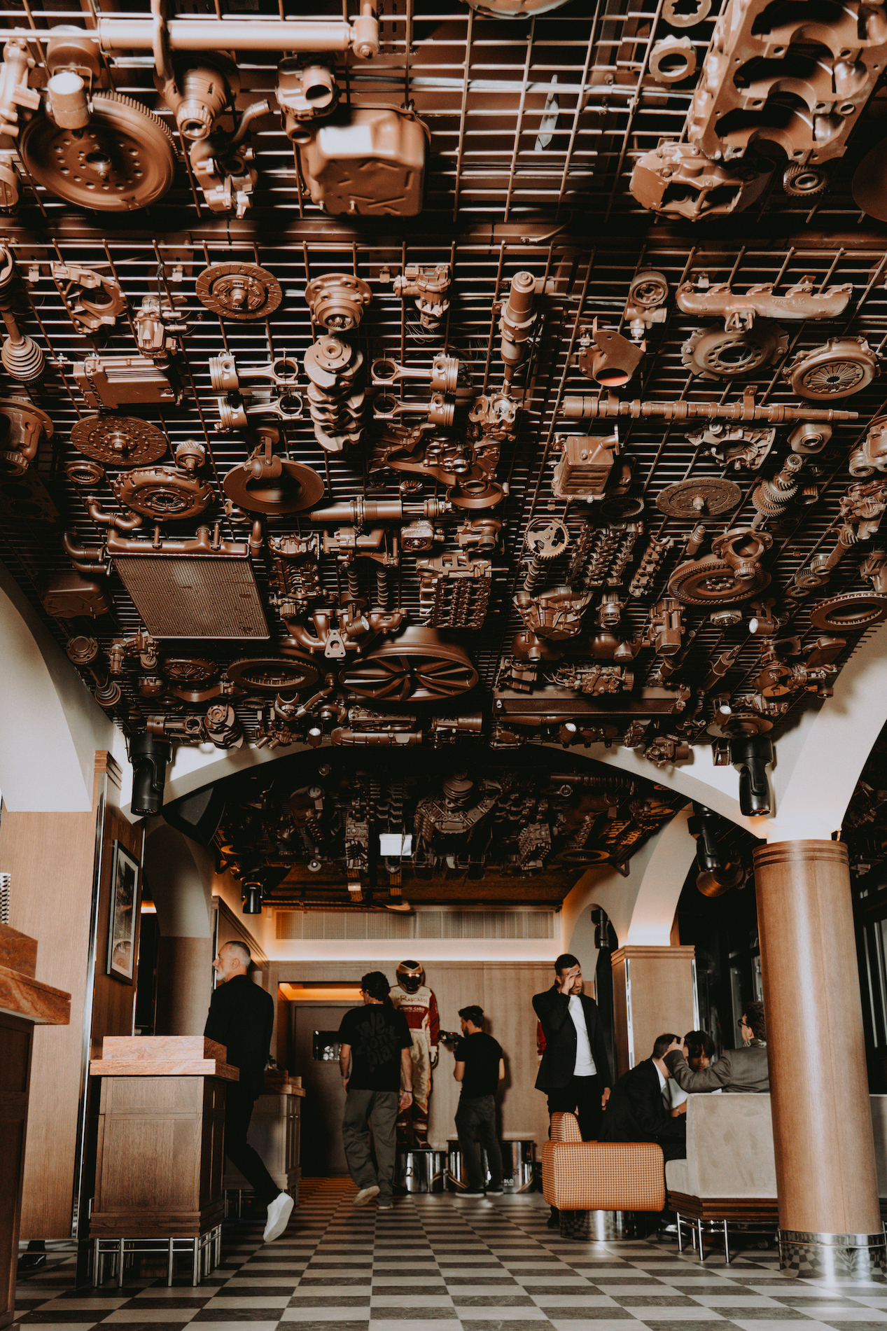 Dès l’entrée, le ton est donné. L’espace a été entièrement repensé autour de l’univers du sport automobile, dans une esthétique à la fois immersive et élégante. Le plafond spectaculaire, composé de moteurs et de pièces mécaniques, attire immédiatement le regard, tandis que le sol à damier évoque les grilles de départ des circuits mythiques. Le rouge et blanc, signatures visuelles de Monaco, rythment l’ensemble et renforcent cette atmosphère vibrante.