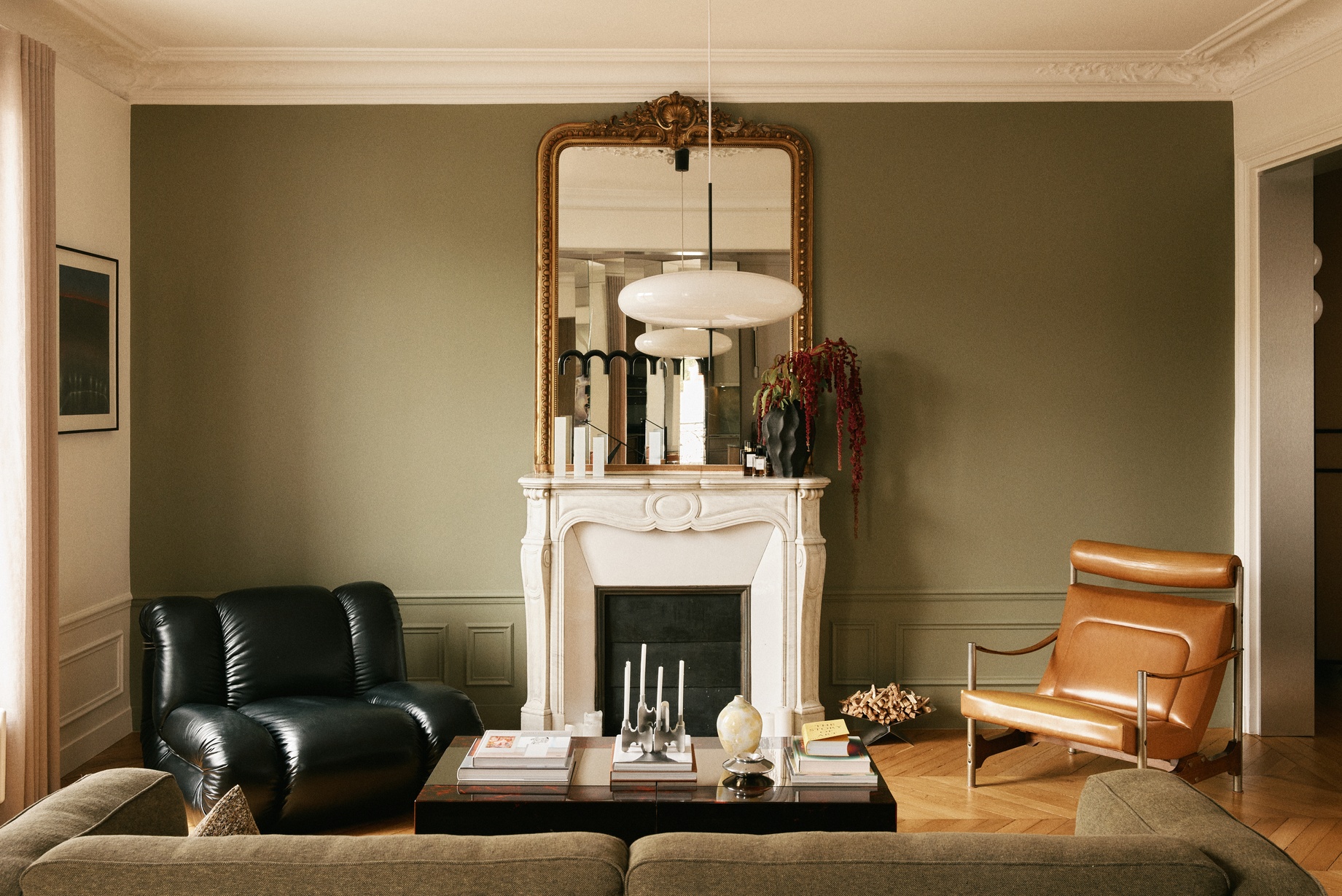 Dès l’entrée, le séjour impose son atmosphère douce et enveloppante. Le parquet ancien en chevron affirme le caractère authentique du lieu, tandis que les cimaises, corniches et la cheminée d’origine composent un décor typiquement parisien. Pour contrebalancer cette élégance classique, l’agence introduit des pièces de design choisies avec précision. Une table basse signée Eric Maville dialogue avec un fauteuil de Gilbert Steiner, insufflant une modernité discrète mais assumée. Les canapés vert olive, en écho aux murs subtilement teintés, créent une harmonie apaisante, presque monochrome. La transition vers la salle à manger se fait naturellement grâce à un meuble-bar sur mesure, ponctué de miroirs. Véritable pièce maîtresse, il reflète la lumière et amplifie les perspectives, apportant profondeur et sophistication à l’ensemble.