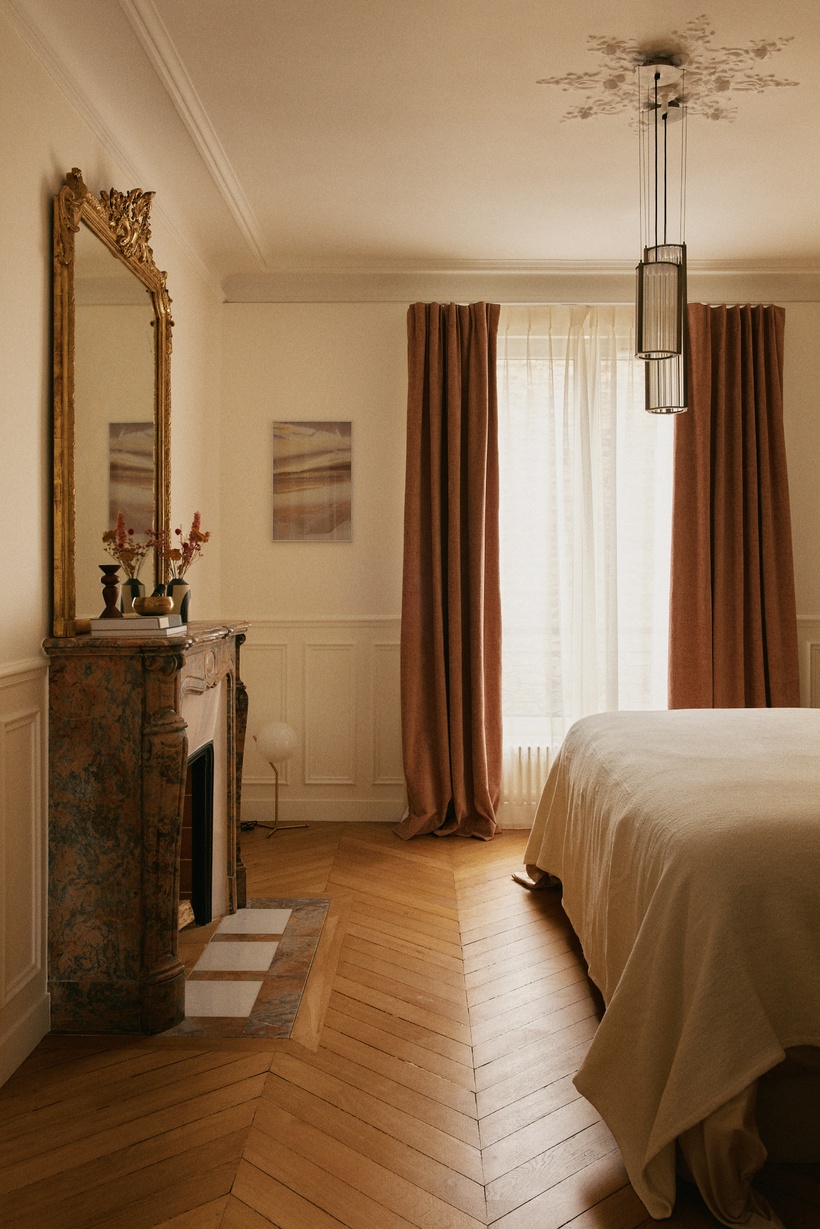 Dans la chambre, les moulures et corniches d’origine composent un écrin délicat. La palette se fait plus douce : beiges chaleureux, touches cuivrées, bois naturel. La tête de lit structure l’espace et accentue l’effet cocon. Une cheminée ancienne surmontée d’un grand miroir capte la lumière et agrandit visuellement la pièce. L’ensemble évoque un refuge feutré, à la fois intemporel et résolument contemporain.