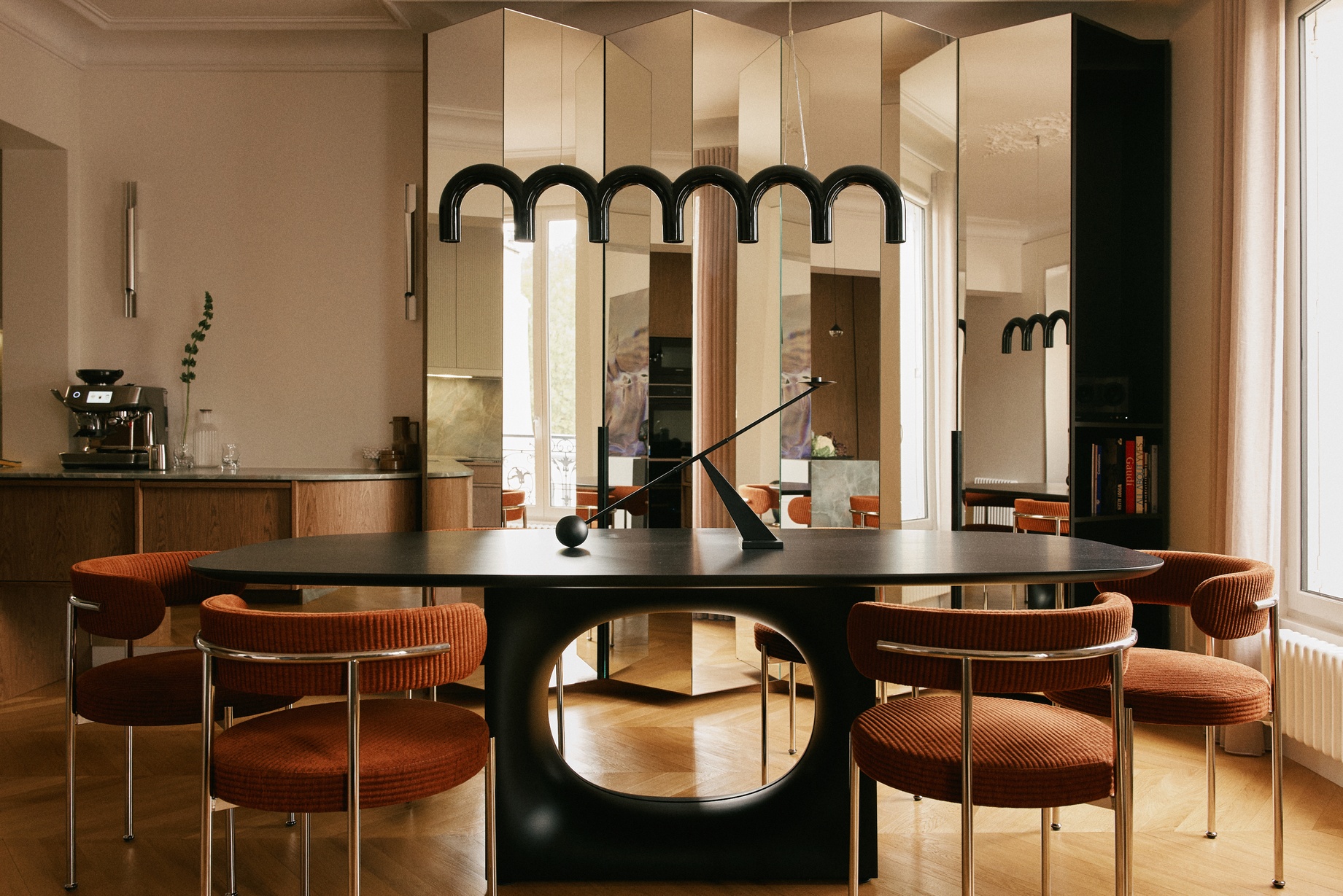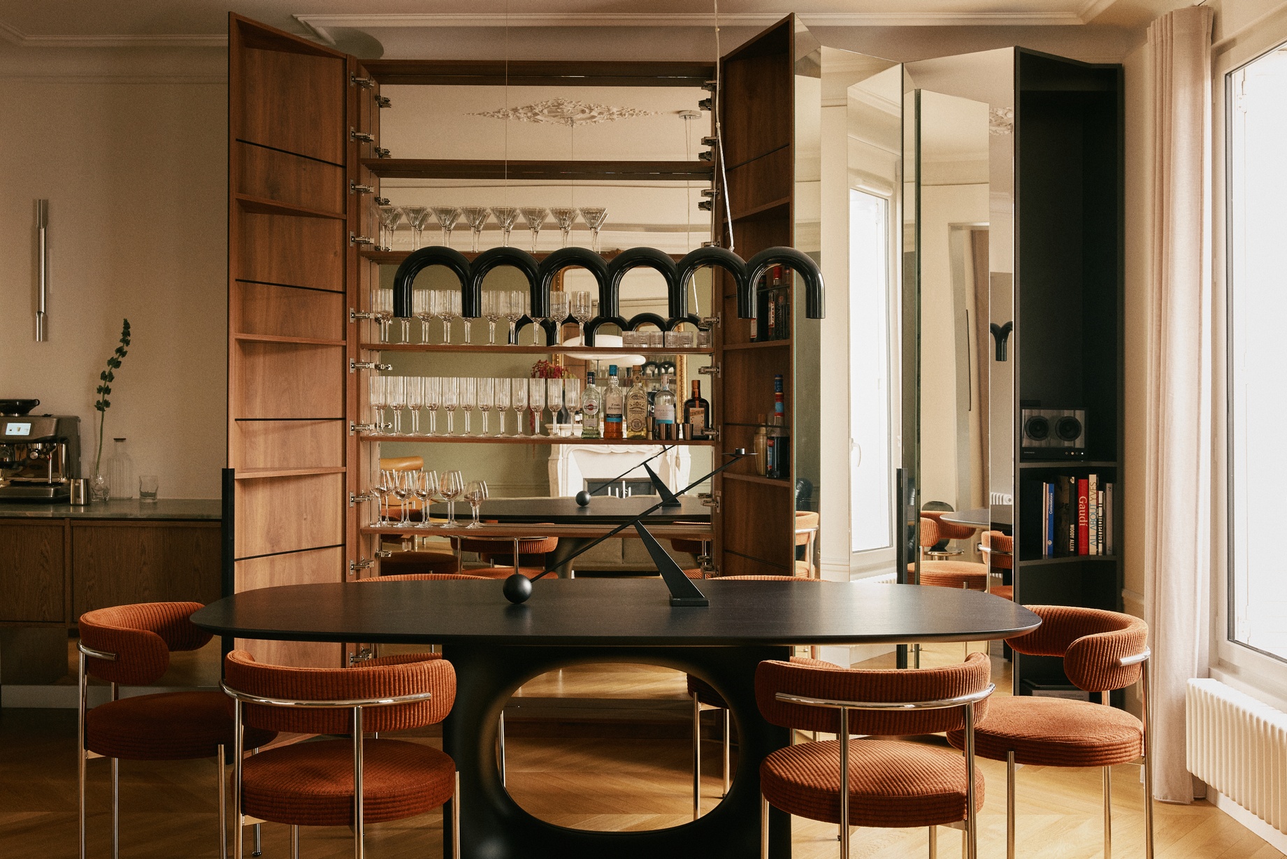 Derrière ses moulures délicates et son parquet en chevron d’origine, se dévoile un intérieur pensé comme un dialogue subtil entre patrimoine et modernité, orchestré par l’agence Kast Design. Ici, rien n’est figé. Chaque détail raconte l’équilibre soigneusement construit entre l’architecture haussmannienne et une écriture plus graphique, presque sculpturale.