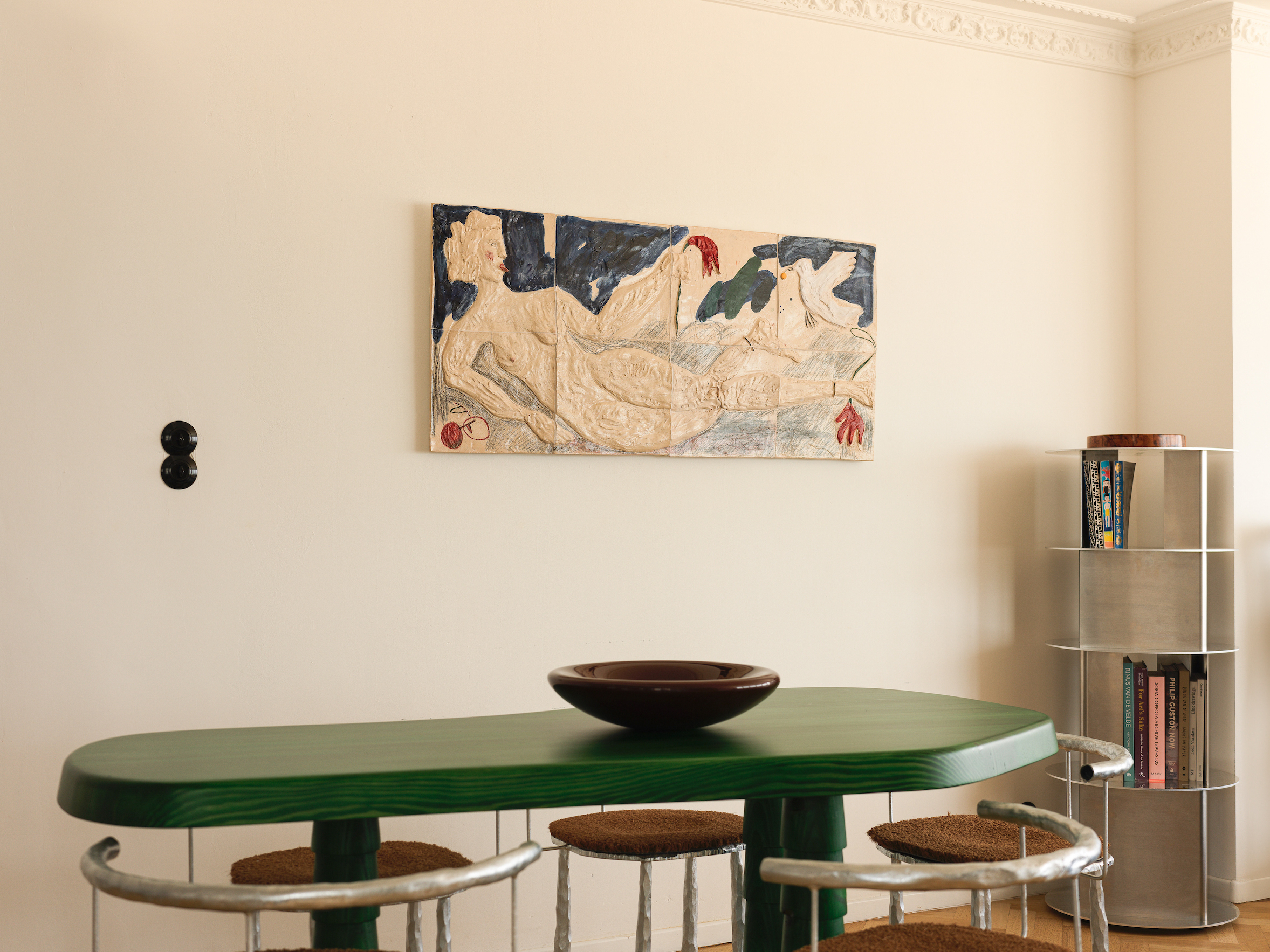 La sélection d’œuvres d’art a été réalisée en collaboration avec Sofie Steegen, qui présente deux de ses nouvelles créations en céramique dans l’appartement. L’artiste développe un langage singulier à travers des peintures murales en carreaux de céramique et des bas-reliefs, dont certains font aussi office de bougeoir mural. Son univers s’inspire de l’érotisme, de la mythologie, de la nature et de la mer.
